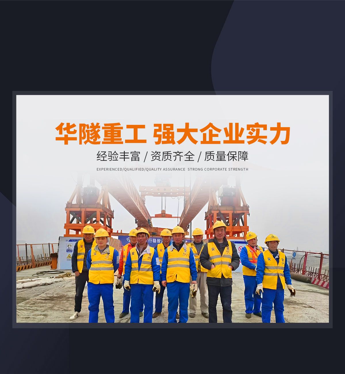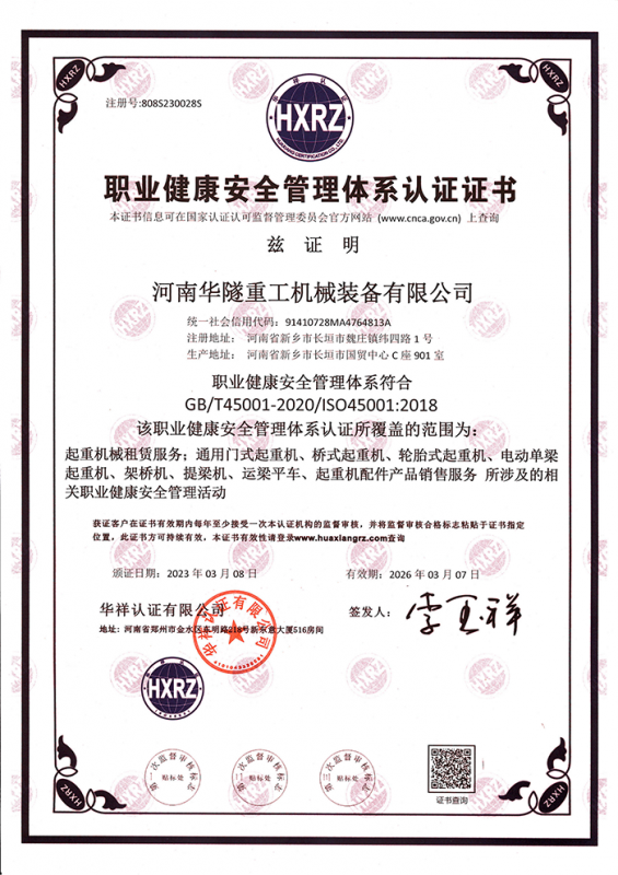 河南華隧重工機(jī)械裝備有限公司主要從事通用門(mén)式起重機(jī)、橋式起重機(jī)、電動(dòng)單梁起重機(jī),輪胎式起重機(jī)、架橋機(jī)、提梁機(jī)、遠(yuǎn)梁平車(chē)、鋼絲繩電動(dòng)萌蘆、卷?yè)P(yáng)機(jī)、起重配件制造、銷(xiāo)售:起重機(jī)械租賃、安裝和維修,起重設(shè)備園收,機(jī)械設(shè)備維修,鋼結(jié)構(gòu)工程承包,橋梁工程及技術(shù)咨淘服務(wù),銷(xiāo)售五金制品、機(jī)電設(shè)備:建設(shè)工程監(jiān)理,建設(shè)工程設(shè)計(jì),各類(lèi)工程建設(shè)活動(dòng),建筑勞務(wù)分包,建筑物折除作業(yè),施工作業(yè),工程管理服務(wù),土石方工程施工,裝如發(fā)運(yùn)。  公司已通過(guò)IS0國(guó)際質(zhì)量、環(huán)境、健康與安全三合一標(biāo)準(zhǔn)認(rèn)證,特種設(shè)備制造許可證和特種設(shè)備安裝改造維修許可證。擁有完熟的質(zhì)量管理體系。嚴(yán)格的管理制度,強(qiáng)大的生產(chǎn)能力和先進(jìn)的檢測(cè)手段,在保證產(chǎn)品質(zhì)量的同時(shí),也具備了極強(qiáng)的市場(chǎng)競(jìng)爭(zhēng)力。  公司堅(jiān)持科技創(chuàng)新為理念,產(chǎn)品質(zhì)量為核心,注重信譽(yù),建立了減信可靠、快捷、思速。便利周到的售后服務(wù)網(wǎng)絡(luò)。  我們擁有的技術(shù)專(zhuān)家和技術(shù)服務(wù)隊(duì)伍為客戶(hù)提供充善的售前技術(shù)支持和全天候的售后服務(wù)體系,讓您無(wú)后顧之憂(yōu),享受一站式的超值服務(wù)。  “華隧重工,伴您成功“是華隧重工永遠(yuǎn)的宗指,真被的希望與各界朋友攜手并進(jìn)。共創(chuàng)輝準(zhǔn)!
